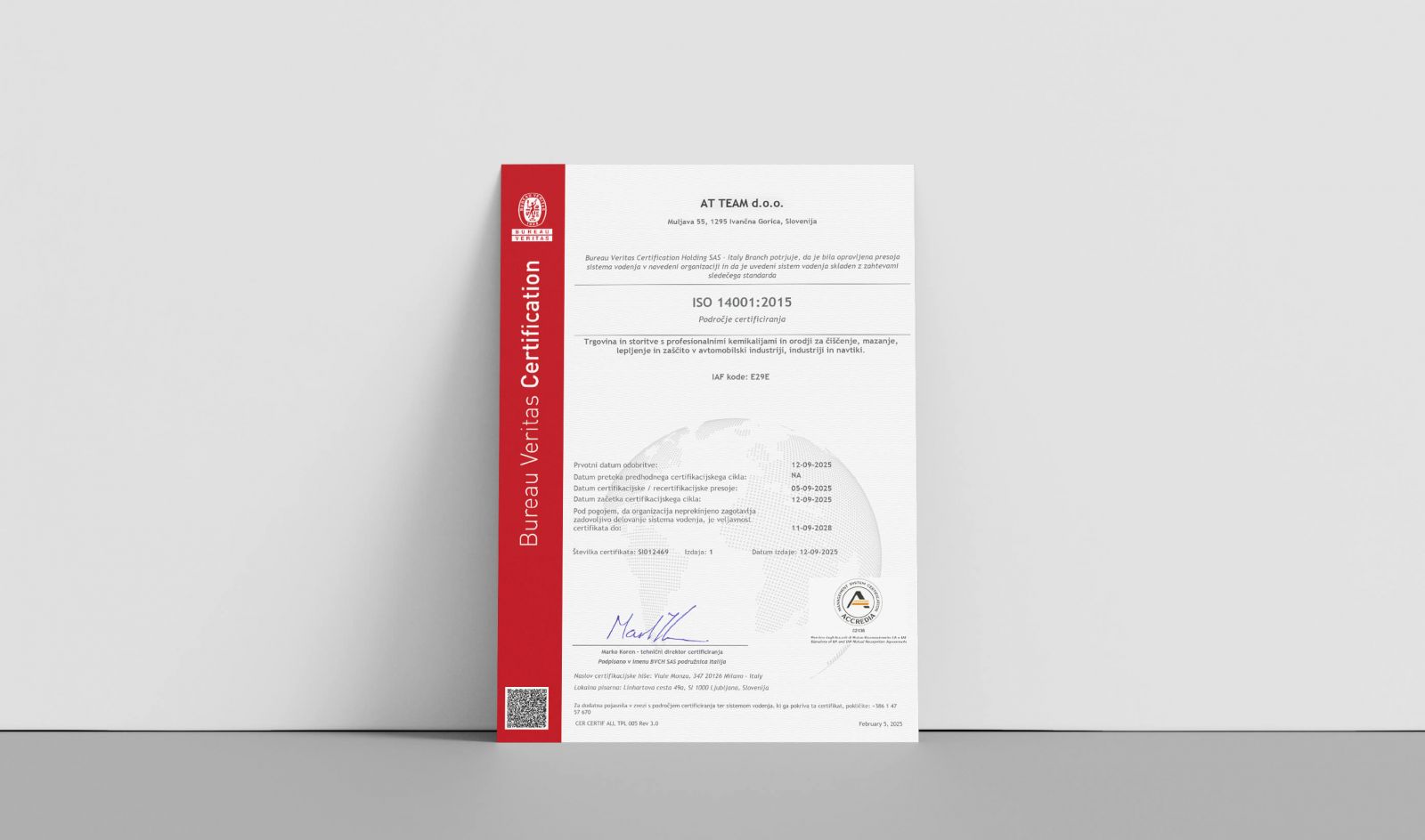 RegistracijaV podjetju AT TEAM d.o.o. smo uspešno pridobili certifikat ISO 14001, ki potrjuje našo predanost trajnostnemu in okolju prijaznemu poslovanju. Certifikat je mednarodno priznana potrditev, da naše delo ni usmerjeno samo v kakovost in učinkovitost, temveč tudi v odgovoren odnos do narave in skupnosti, v kateri delujemo.